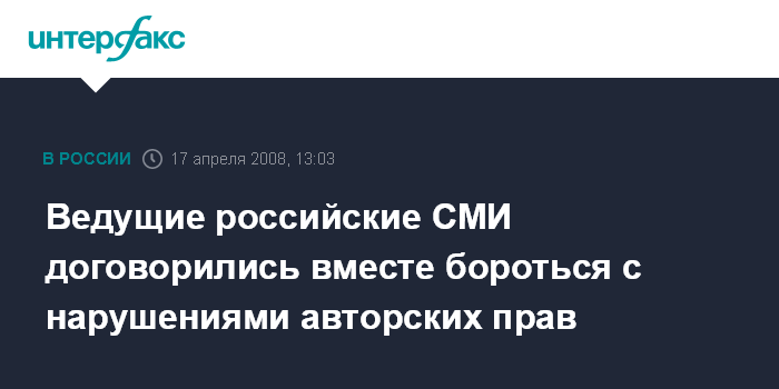 Москва. 17 апреля. INTERFAX.RU - Ведущие российские средства массовой информации договорились о совместной разработке мер по защите авторских прав на создаваемые текстовые, фото-, аудио-, видеоматериалы и другой контент.