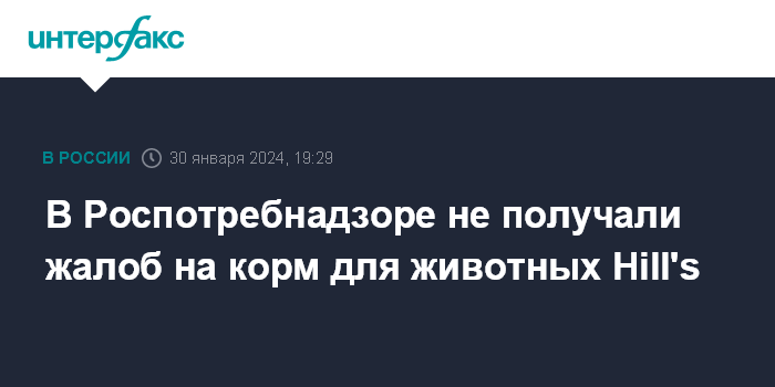 Москва. 30 января. INTERFAX.RU - В Роспотребнадзор не приходили жалобы со стороны потребителей на корм для животных Hill's, сообщили в пресс-службе ведомства "Интерфаксу".