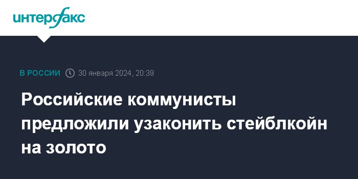 Москва. 30 января. INTERFAX.RU - Группа депутатов от фракции КПРФ внесла в Госдуму законопроект, который предлагает ввести в закон о цифровых финансовых активах (ЦФА) определение стейблкойнов, обеспеченных золотом, и разрешить использовать их при расчетах во внешнеторговой деятельности, не дожидаясь принятия поправок в закон об экспериментальных правовых режимах.