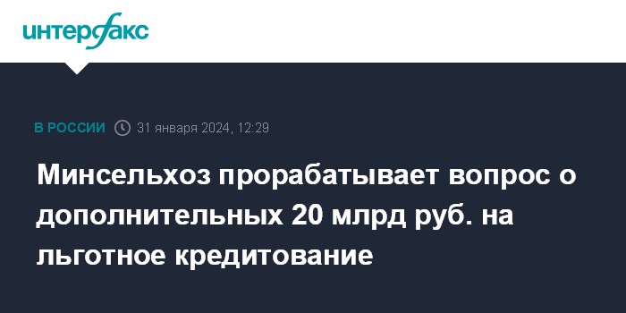 Москва. 31 января. INTERFAX.RU - Минсельхоз РФ прорабатывает вопрос о дополнительном выделении 20 млрд рублей на льготное кредитование АПК в 2024 году.