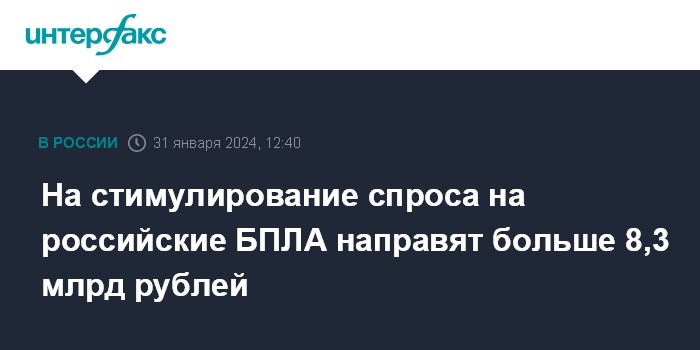 Москва. 31 января. INTERFAX.RU - В 2024 году на достижение целей и результатов федерального проекта "Стимулирование спроса на отечественные беспилотные авиационные системы будет направлено свыше 8,3 млрд рублей, эти деньги распределят между 30 регионами, следует из распоряжения правительства, с которым ознакомился "Интерфакс".