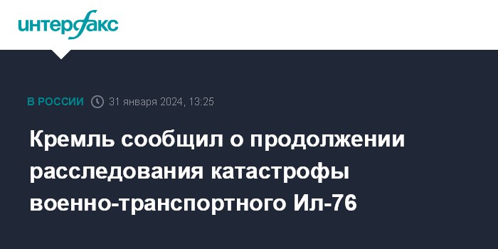 Москва. 31 января. INTERFAX.RU - Расследование катастрофы военно-транспортного Ил-76 в Белгородской области продолжается, заявил пресс-секретарь президента РФ Дмитрий Песков.