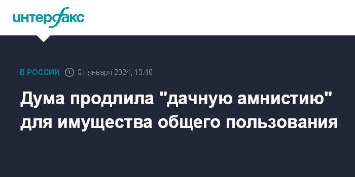 Москва. 31 января. INTERFAX.RU - Госдума в среду приняла в третьем, окончательном, чтении закон о продлении до 1 марта 2031 года действия "дачной амнистии" для зданий и сооружений, относящихся к имуществу общего пользования садоводческих и огороднических товариществ.