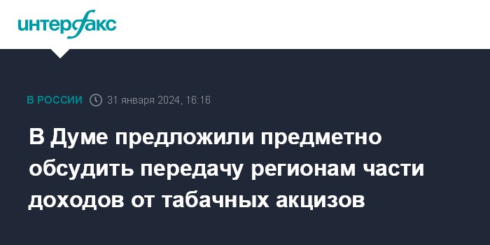 Москва. 31 января. INTERFAX.RU - Вопрос о перераспределении доходов от табачных акцизов между федеральным и региональными бюджетами, который поднимается не первый год, пора уже рассмотреть предметно, считает зампредседателя комитета Госдумы по экономической политике Артем Кирьянов. Он заявил об этом на пресс-конференции в "Интерфаксе".
