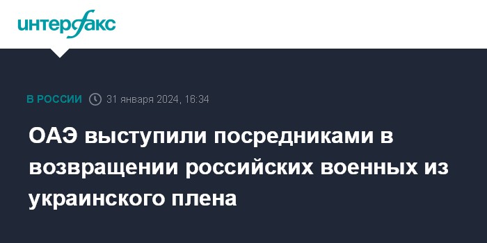 Москва. 31 января. INTERFAX.RU - Объединенные Арабские Эмираты приняли посредническое гуманитарное участие в вопросе возвращении из украинского плена российских военнослужащих, сообщили в Минобороны РФ в среду.
