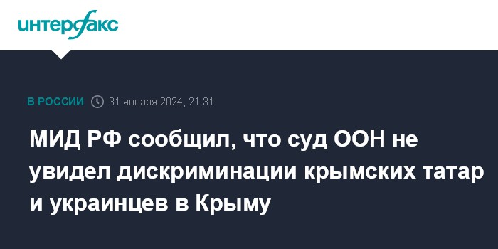 Москва. 31 января. INTERFAX.RU - Международный суд ООН признал, что дискриминации в отношении крымских татар и украинцев в Крыму нет, всем желающим на полуострове и далее будет предоставляться возможность обучаться на украинском языке в соответствии с действующим законодательством, заявил МИД РФ в среду в сообщении, касающемся признания Международным судом ООН отсутствия в России дискриминации крымских татар и украинцев и полном отказе Украине в компенсациях по её претензиям.