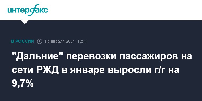 Москва. 1 февраля. INTERFAX.RU - В январе 2024 года перевозки пассажиров в поездах дальнего следования увеличились в годовом выражении на 9,7%, до 9,7 млн человек, сообщило ОАО "Российские железные дороги" со ссылкой на оперативные данные.