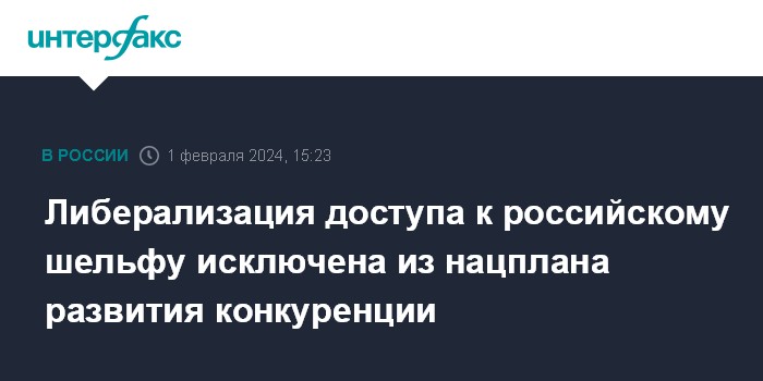Москва. 1 февраля. INTERFAX.RU - Правительство убрало из Национального плана ("дорожной карты") развития конкуренции в России на 2021-2025 годы идею либерализации доступа к шельфу.