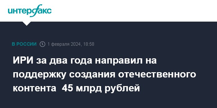 ИРИ за два года направил на поддержку создания отечественного контента 45 млрд рублей