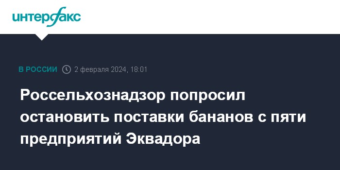 Москва. 2 февраля. INTERFAX.RU - Россельхознадор просит Эквадор с 5 февраля приостановить поставки бананов пяти экспортеров из-за выявления опасного карантинного для России и стран ЕАЭС вредителя - многоядной мухи-горбатки, сообщила пресс-служба ведомства.