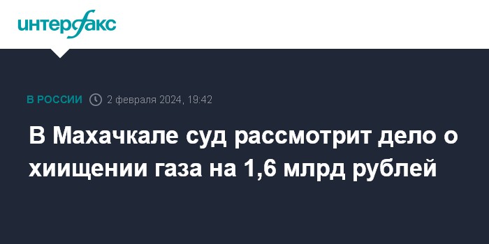 Москва. 2 февраля. INTERFAX.RU - В Махачкале Ленинский районный суд рассмотрит уголовное дело о хищении природного газа на сумму более 1,6 млрд рублей, сообщила прокуратура Дагестана.