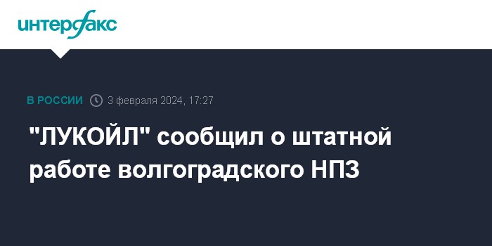 Москва. 3 февраля. INTERFAX.RU - Волгоградский НПЗ продолжает свою деятельность в штатном режиме, сообщает "ЛУКОЙЛ".