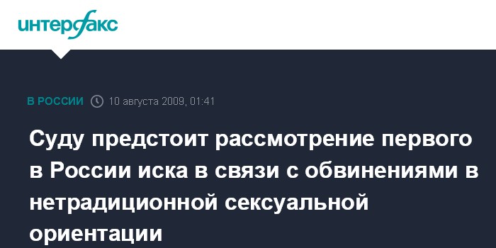 Москва. 10 августа. ИНТЕРФАКС - Савеловский суд Москвы приступит к рассмотрению первого в России иска о защите чести и достоинства в связи с распространением информации о нетрадиционной сексуальной ориентации истца.