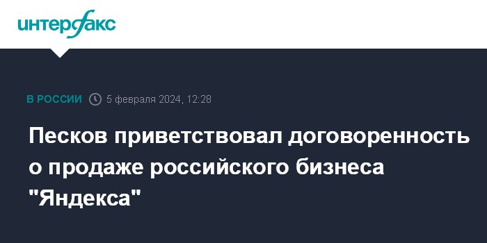 Москва. 5 февраля. INTERFAX.RU - В Кремле приветствуют договоренность о продаже российского бизнеса "Яндекса" консорциуму частных инвесторов, заявил пресс-секретарь президента РФ Дмитрий Песков.