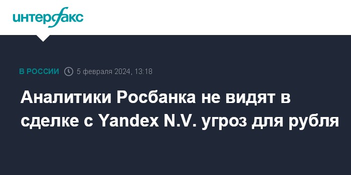 Москва. 5 февраля. INTERFAX.RU - Сделка нидерландской Yandex N.V. по продаже российского бизнеса не представляет угроз для рубля, полагают аналитики Росбанка.
