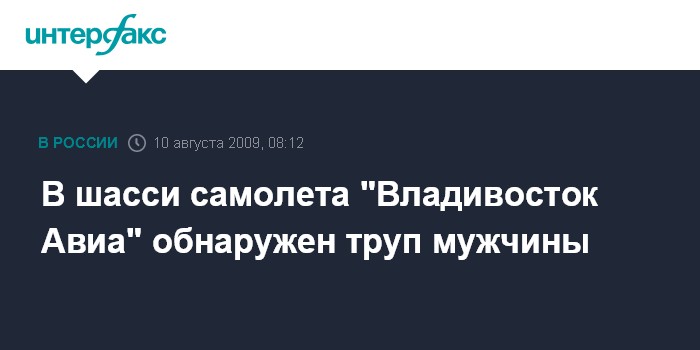 Москва. 10 августа. INTERFAX.RU - В техническом отсеке шасси самолета А320 компании ОАО "Владивосток Авиа" найдено тело неизвестного пока мужчины. Как сообщил в понедельник агентству "Интерфакс - Дальний Восток" помощник гендиректора "Владивосток Авиа" и начальник службы по связям с общественностью Александр Алексеев, погибший мужчина был обнаружен 9 августа при послеполетном осмотре воздушного судна, которое совершало рейс N486 по маршруту Иркутск-Хабаровск-Владивосток. Алексеев рассказал, что сначала осмотровая группа заметила кисть руки между створками гондолы левой стойки шасси. При вскрытии ниши был обнаружен труп мужчины.