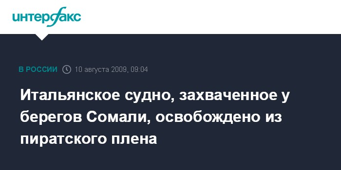 Москва. 10 августа. INTERFAX.RU - Сомалийские пираты освободили итальянское буксирное судно, захваченное ими в апреле, объявил министр иностранных дел Италии Франко Фраттини. По его словам, освобождение судна "Буканир" - результат совместных усилий властей Италии и Сомали. По словам Фраттини, пираты не получили никакого выкупа.