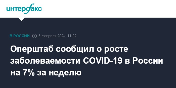 Москва. 6 февраля. INTERFAX.RU - В России за неделю с 29 января по 4 февраля заболеваемость коронавирусной инфекцией выросла к предыдущей неделе на 7,2%, сообщил федеральный оперштаб по борьбе с коронавирусом.