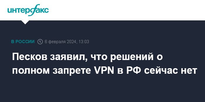 Москва. 6 февраля. INTERFAX.RU - Никаких решений насчет полного запрета сервисов VPN в России на данный момент не принято, сообщил пресс-секретарь президента РФ Дмитрий Песков.