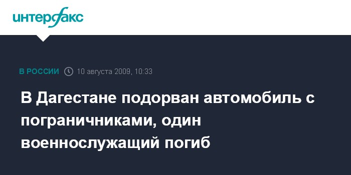 Москва. 10 августа. INTERFAX.RU - В дагестанском городе Дербенте на пути следования автомобиля с военнослужащими пограничных войск сработало взрывное устройство. Как сообщил "Интерфаксу" старший помощник руководителя следственного управления СКП РФ по Дагестану Мизами Раджабов, по предварительной информации, погиб один военнослужащий-контрактник, еще один получил ранения. Инцидент произошел около 08:00 мск понедельника.