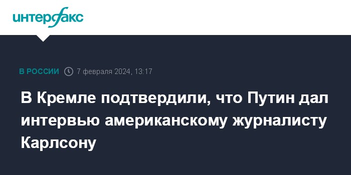 Москва. 7 февраля. INTERFAX.RU - Пресс-секретарь президента РФ Дмитрий Песков подтвердил, что американский журналист Такер Карлсон взял интервью у Владимира Путина.