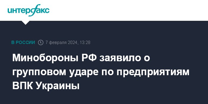 Москва. 7 февраля. INTERFAX.RU - Российские военные заявили, что в среду утром нанесли групповой удар по предприятиям военно-промышленного комплекса Украины.