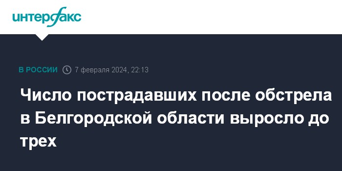 Москва. 7 февраля. INTERFAX.RU - Губернатор Белгородской области Вячеслав Гладков сообщил об увеличении числа пострадавших после первой атаки Белгородской области, когда по региону было выпущено семь снарядов реактивной системы залпового огня RM-70 Vampire.