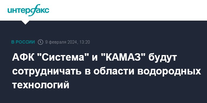 Москва. 9 февраля. INTERFAX.RU - ПАО АФК "Система" и ПАО "КАМАЗ" договорились о сотрудничестве в сфере развития водородных технологий, сообщила корпорация.