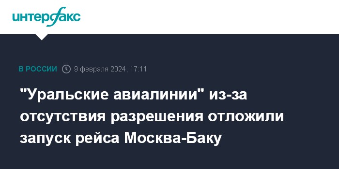 "Рейс (8 февраля - ИФ) не состоялся, так как авиационные власти Азербайджана не выдали на это разрешения, несмотря на то, что у "Уральских авиалиний" есть назначение, а также все технические возможности для выполнения и обеспечения рейса. Причину такого решения авиавласти Азербайджана не уточнили", - сообщили "Интерфаксу" в пресс-службе авиакомпании.