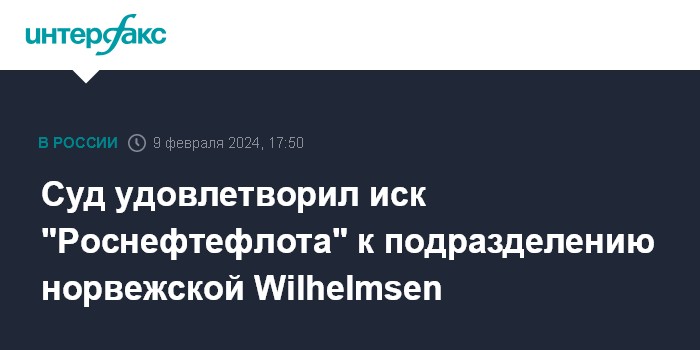 Москва. 9 февраля. INTERFAX.RU - Арбитражный суд Санкт-Петербурга и Ленинградской области полностью удовлетворил иск АО "Роснефтефлот" к нидерландскому подразделению норвежской группы Wilhelmsen на $50 тысяч, сообщается в материалах дела.