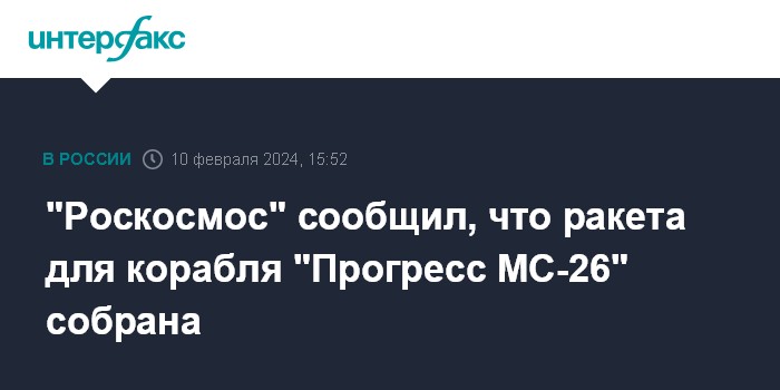 Москва. 10 февраля. INTERFAX.RU - Ракета "Союз-2.1а", которая готовится к старту с грузовым кораблем "Прогресс МС-26", собрана, сообщил в субботу "Роскосмос".