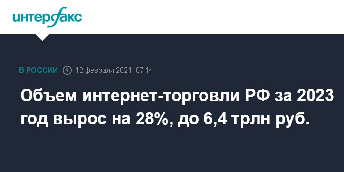 Москва. 12 февраля. INTERFAX.RU - Объем интернет-торговли в России по итогам 2023 года увеличился на 28% и составил 6,4 трлн рублей, такую оценку приводит Ассоциация компаний интернет-торговли (АКИТ).