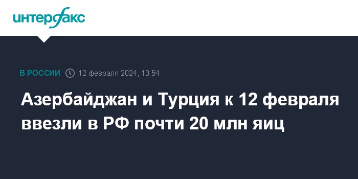 Азербайджан и Турция к 12 февраля ввезли в РФ почти 20 млн яиц