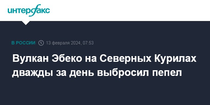 Москва. 13 февраля. INTERFAX.RU - Второй за день выброс пепла на высоту 2,5 км над уровнем моря зафиксирован на вулкане Эбеко, расположенном на северокурильском острове Парамушир, сообщает пресс-служба ГУ МЧС по Сахалинской области во вторник.