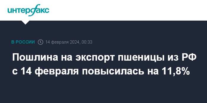 Пошлина на экспорт пшеницы из РФ с 14 февраля повысилась на 11,8%