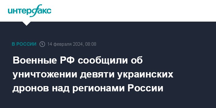 Москва. 14 февраля. INTERFAX.RU - Министерство обороны России заявило, что в ночь на среду силы ПВО сбили девять украинских беспилотников, в том числе шесть дронов - над Черным морем.