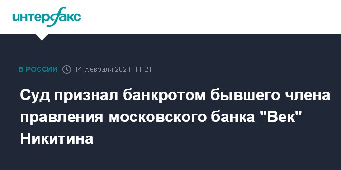 Москва. 14 февраля. INTERFAX.RU - Арбитражный суд Москвы во вторник, 13 февраля, по заявлению московского банка "Век" в лице Агентства по страхованию вкладов (АСВ, конкурсный управляющий) признал несостоятельным (банкротом) бывшего члена правления этой кредитной организации Андрея Никитина.