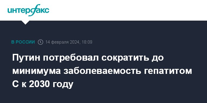 Москва. 14 февраля. INTERFAX.RU - Заболеваемость гепатитом С в России должна быть снижена до минимума к 2030 году, заявил на пленарном заседании Форума будущих технологий президент Владимир Путин.