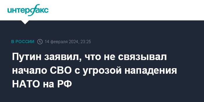Москва. 14 февраля. INTERFAX.RU - Президент РФ Владимир Путин заявил, что не обозначал причиной начала СВО на Украине угрозу нападения НАТО на Россию.