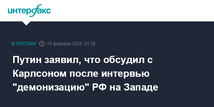 Москва. 15 февраля. INTERFAX.RU - Президент РФ Владимир Путин заявил, что после интервью американскому журналисту Такеру Карлсону обсудил с ним "демонизацию" России в западных странах.