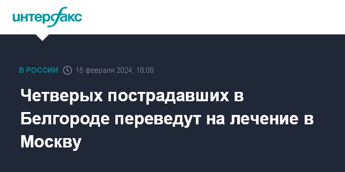 Москва. 15 февраля. INTERFAX.RU - Лечиться в Москву отправят четверых пострадавших в результате обстрела торгового центра в Белгороде, среди них двое детей, сообщил помощник министра здравоохранения России Алексей Кузнецов.