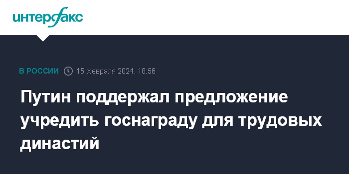 Президент напомнил, что недавно в России были учреждены знак "За успехи в труде" и орден "За доблестный труд". "Но так, чтобы как-то развернуться в сторону трудовых династий, в голову мне не приходило. Идея хорошая", - сказал Путин.