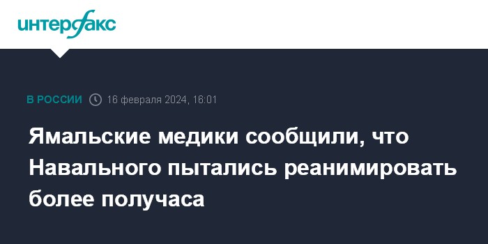 Москва. 16 февраля. INTERFAX.RU - Бригада скорой помощи за семь минут доехала до колонии, где отбывал наказание Алексей Навальный, еще две минуты ушло на путь к пациенту, реанимировать его пытались более получаса, сообщили "Интерфаксу" в Лабытнангской городской больнице (Ямало-Ненецкий автономный округ).