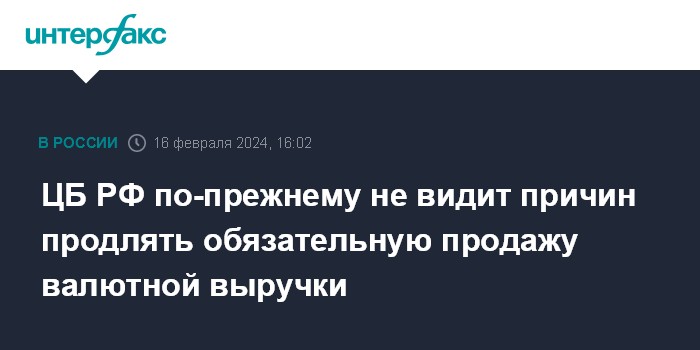 ЦБ РФ не видит веских причин для продления обязательной продажи валютной выручкиЧитать подробнее"Банк России не видит таких весомых оснований для продления обязательной продажи валютной выручки. На наш взгляд, важность этой меры, меры по обязательной продаже валютной выручки, для того, чтобы стабилизировать обменный курс, значимо уступает другим мерам, другим эффектам", - сказала она.