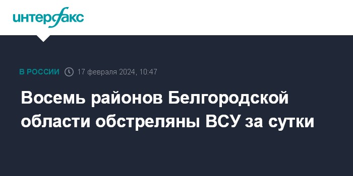 Москва. 17 февраля. INTERFAX.RU - Губернатор Белгородской области Вячеслав Гладков сообщил в субботу в своем телеграм-канале об ударах, нанесенных ВСУ по территории региона за минувшие сутки.