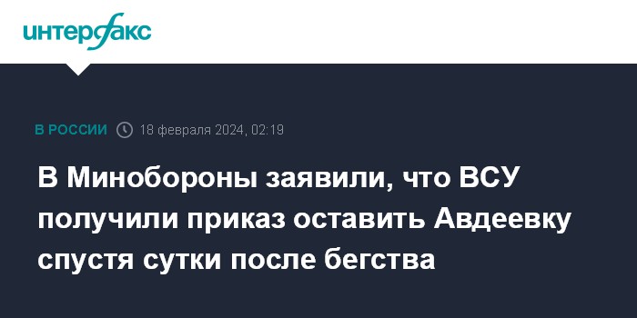 Москва. 18 февраля. INTERFAX.RU - Министерство обороны России заявило, что приказ главкома вооруженных сил Украины Александра Сырского оставить Авдеевку был дан через сутки после начала неконтролируемого бегства украинских подразделений из города.