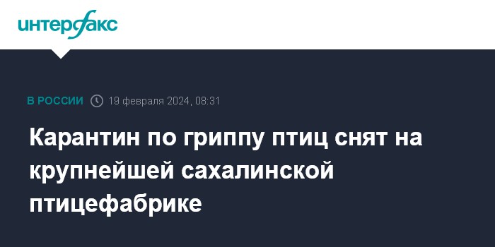 Москва. 19 февраля. INTERFAX.RU - Власти Сахалинской области сняли карантин на птицефабрике "Островная" в Южно-Сахалинске, где в начале февраля произошел массовый падеж птицы и выявили грипп птиц.