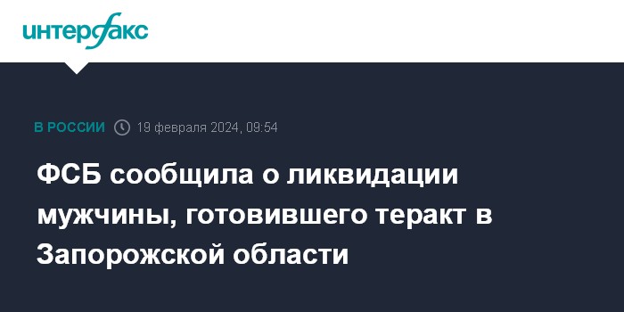 Москва. 19 февраля. INTERFAX.RU - ФСБ сообщила, что нейтрализовала при задержании гражданина РФ, готовившего теракт в отношении одного из политических деятелей Запорожской области.