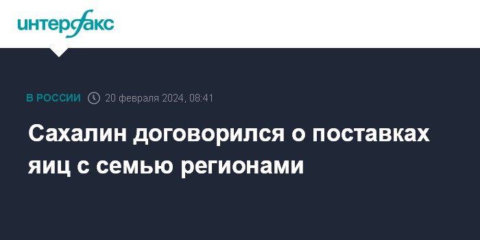 Москва. 20 февраля. INTERFAX.RU - На Сахалин в ближайшие дни должны доставить 3,7 млн яиц из семи российских регионов, с ними договорились о поставках, поскольку основной местный поставщик - птицефабрика "Островная" - остановил производство из-за массового падежа птицы, сообщает пресс-служба областного правительства.
