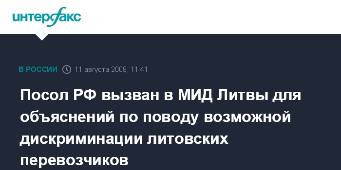 Москва. 11 августа. INTERFAX.RU - Российский посол Владимир Чхиквадзе вызван в МИД Литвы для объяснений по поводу "дискриминирующих" действий российских таможенников в отношении литовских автоперевозчиков, сообщил во вторник агентству BNS пресс-атташе внешнеполитического ведомства республики Роландас Качинскас (Rolandas Kacinskas).